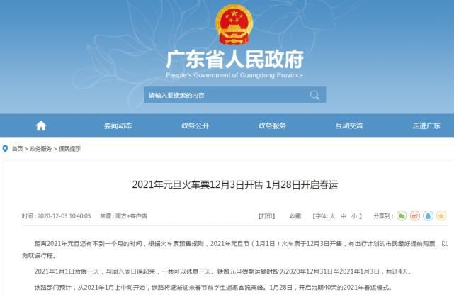 事實上,12月3日,廣東省人民政府官網(wǎng)上發(fā)布了《2021年元旦火車票12月3日開售 1月28日開啟春運》一文,文章中明確表示 “1月28日,開啟為期40天的2021年春運。”